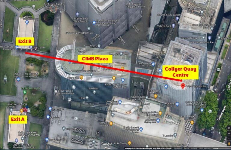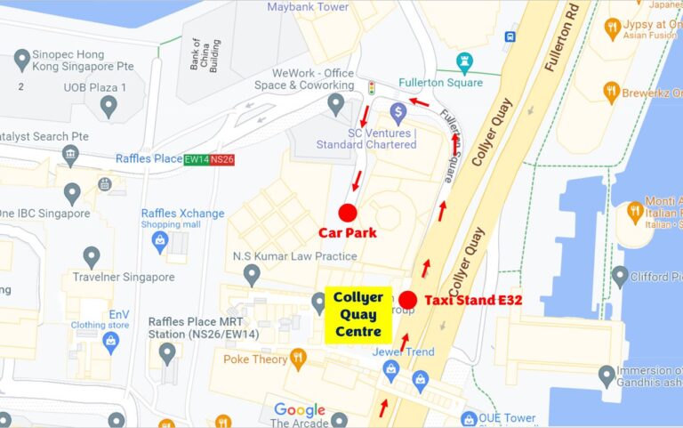 Raffles Place MRT (EW14-NS26) – Exit from Exit B, pass through CIMB Plaza, take the escalator and proceed to lift lobby on the 2nd level. (Check HERE for direction in detail.)
